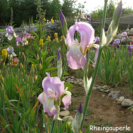 Next comes 'Rheingauperle' from 1924. Well named, meaning 'pearl of the Rheingau', a wine producing region north of the Rhine, it is truly a gem of an iris. Tall stems bear flowers of a lovely, delicate, orchid pink with a heart of white. The white beards fade into soft yellow-orange in the throat, and the form is long and open with the petals far more narrow than usually seen. It is enchanting, especially with the morning sun shining thru it, and was one of the best pink-toned irises of its day - and widely celebrated because of it.